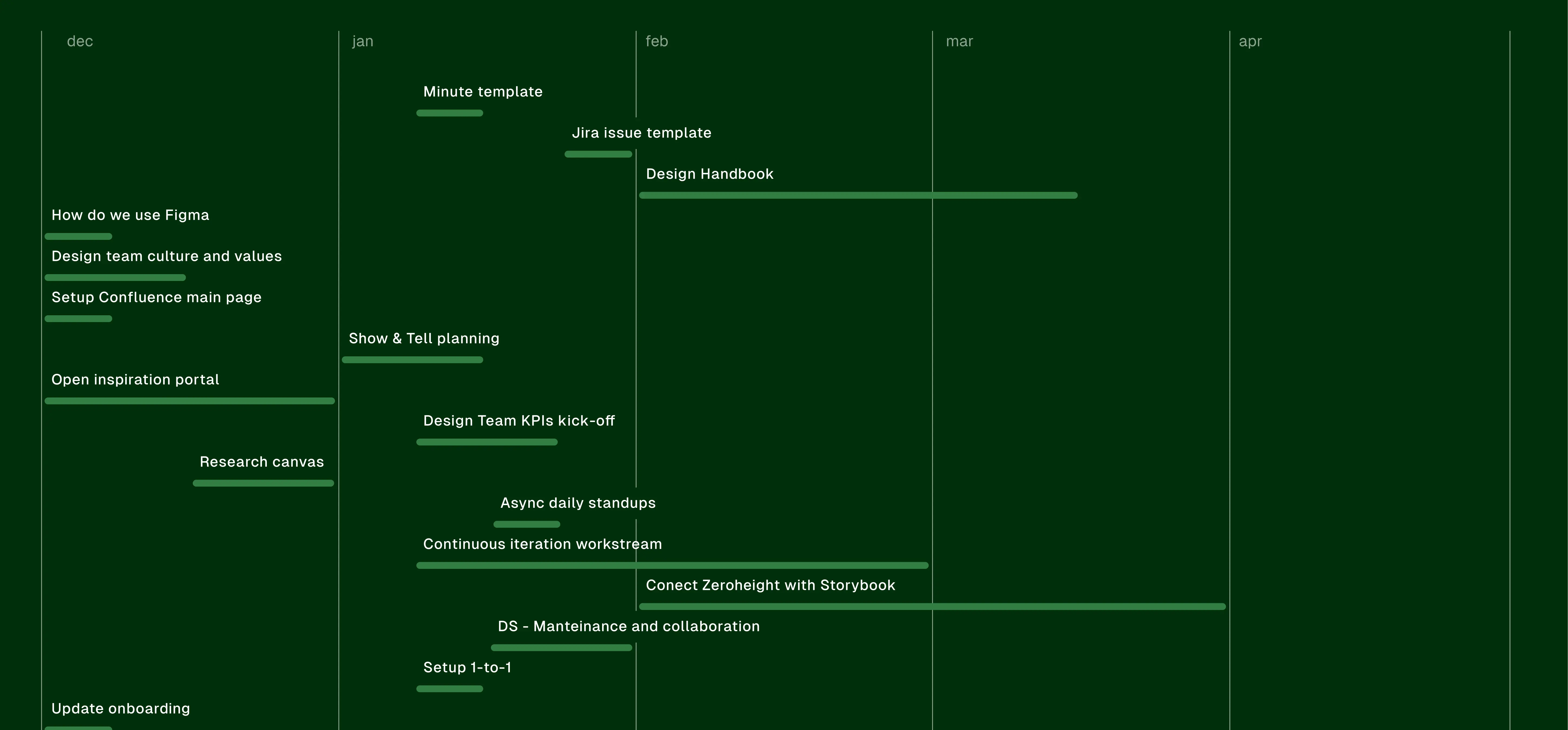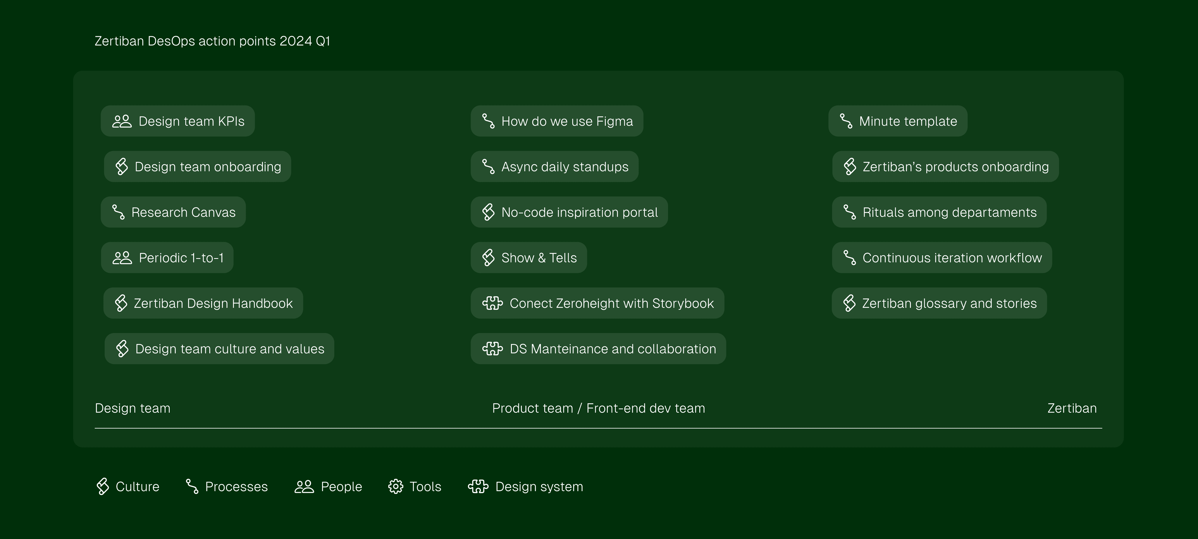 Then, I identified key actions across four areas: culture, people, processes, and tools, with an additional focus on our design system. For each task, I defined its goal, impact, effort and deadlines with the support of my design colleagues.